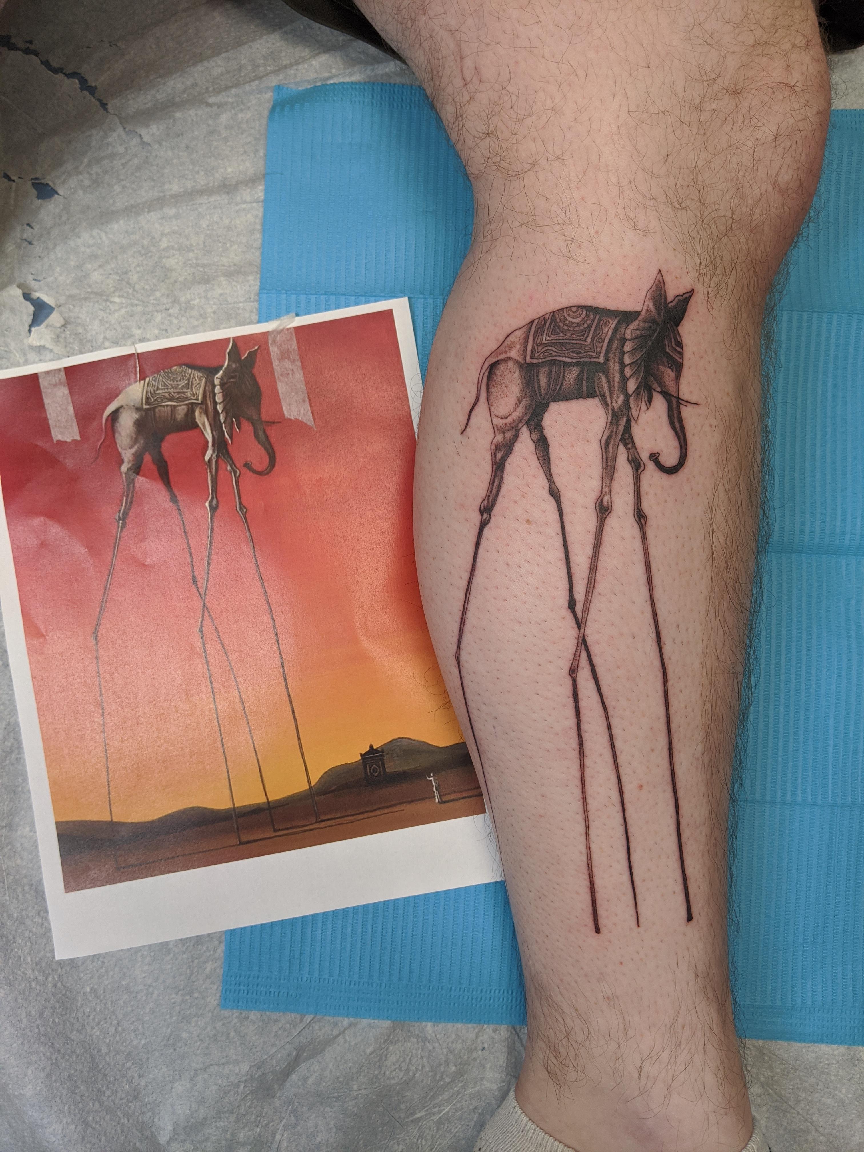 Seine kunstwerke in "the elephants" sind weltbekannt als symbol für große stärke, vorherrschaft, autorität und begierde. Black and blue ink dali elephant tattoo on leg. Salvador dali elephant tattoo by steve hanley at sinister ink in western australia. Back legs dali elephant tattoos. Black and white dali elephant tattoo on calf.. Salvador dali elephant tattoo by steve hanley at sinister ink in western australia.